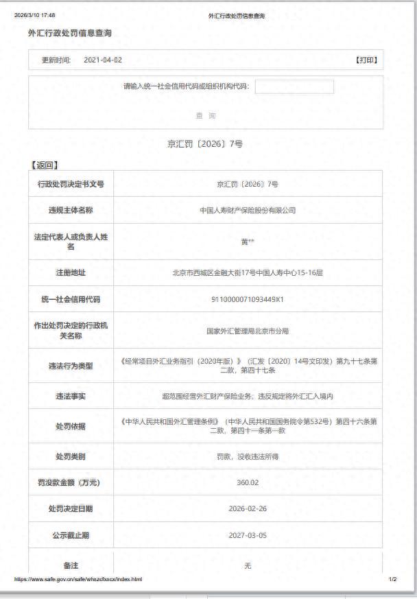 中国人寿保险股份有限公司(下称“中国人寿”)因违反外汇账户及登记管理规定,被警告并罚款35万元;其旗下中国人寿财产保险股份有限公司(下称“国寿财险”)则因两项违规行为,被罚款并没收违法所得合计360.02万元。