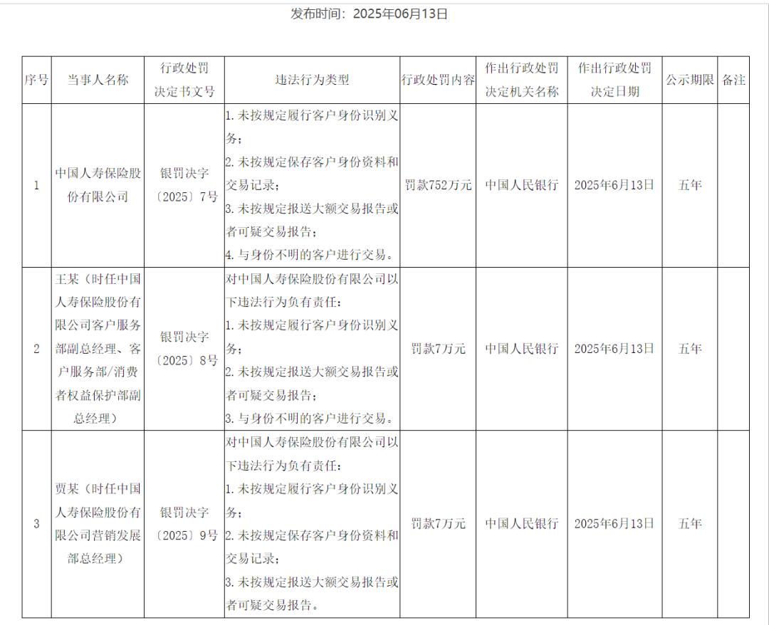 国寿系的合规压力,并非仅集中在外汇领域。回顾过往处罚记录,去年中国人寿曾因四项反洗钱相关违规,被中国人民银行罚款752万元,两名管理人员也分别被处以7万元罚款。具体来看,其违规行为包括未按规定履行客户身份识别义务、未按规定保存客户身份资料和交易记录、未按规定报送大额交易报告或可疑交易报告,以及与身份不明的客户进行交易。