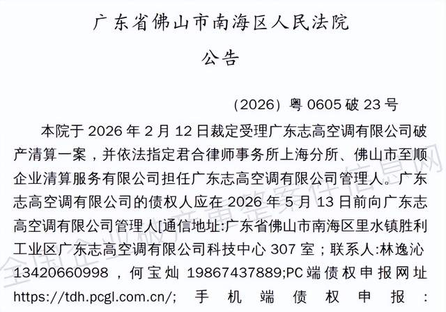 最近,佛山市南海区人民法院一纸公告,裁定受理广东志高空调有限公司的破产清算。