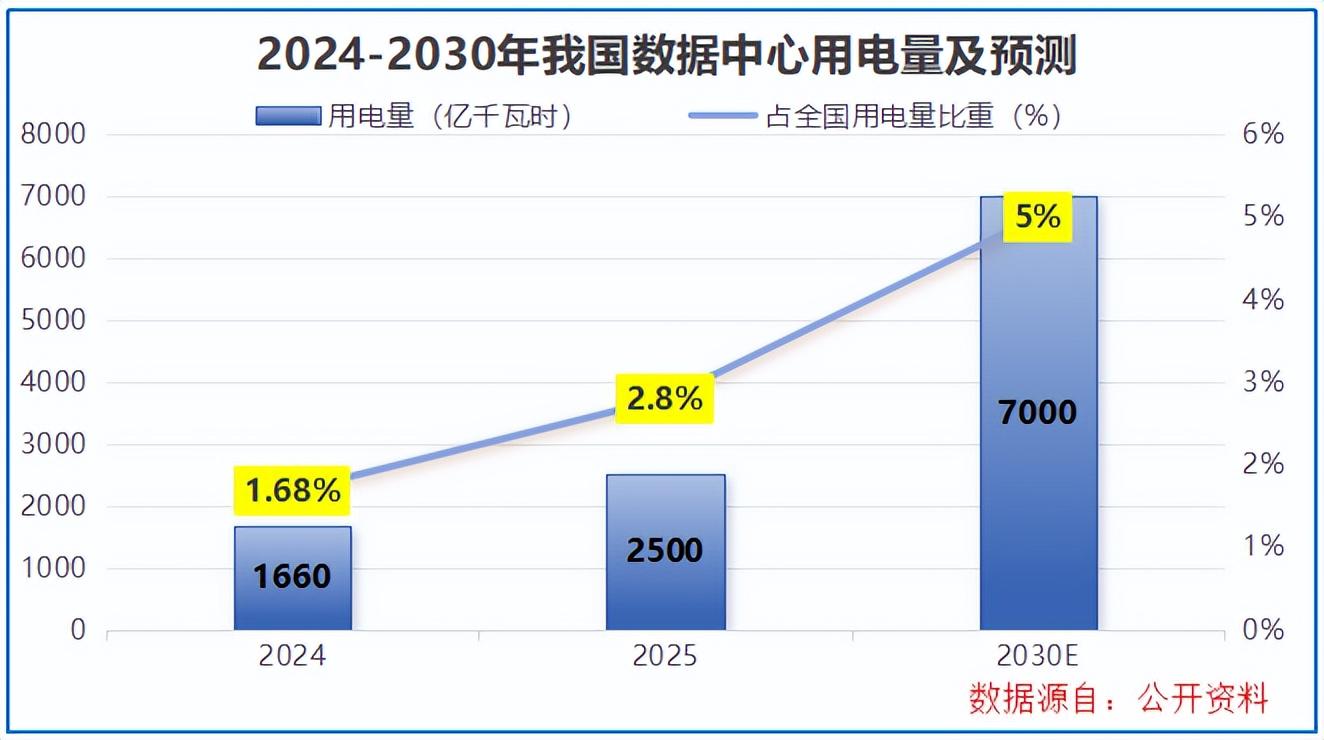 行业预测,至2030年这一用电量及占比有望提升至7000亿千瓦时和5%,相当于3-4个中等省份的年用电量,可见电力需求的增长早已超乎我们的想象。