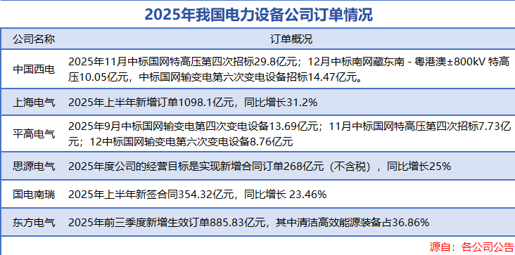东方电气、国电南瑞、中国西电等在2025年就有明确的订单或中标公告,其中东方电气在2025年三季报中更是透露,其前三季度新增有效订单高达885.83亿元。