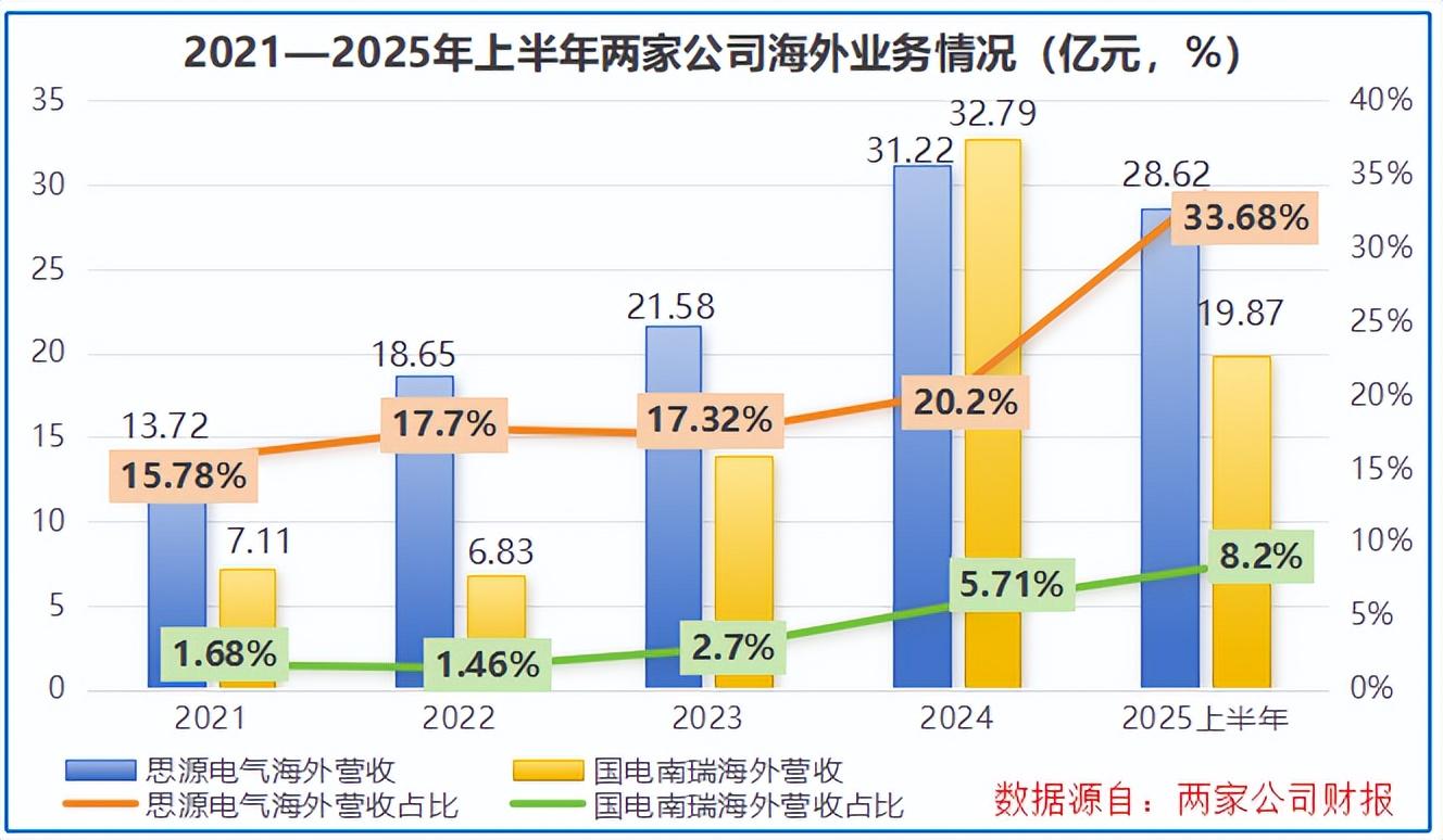 2025年上半年公司海外营收有28.62亿元,占总营收的比重达到了33.68%,明显高于同期国电南瑞的8.2%。