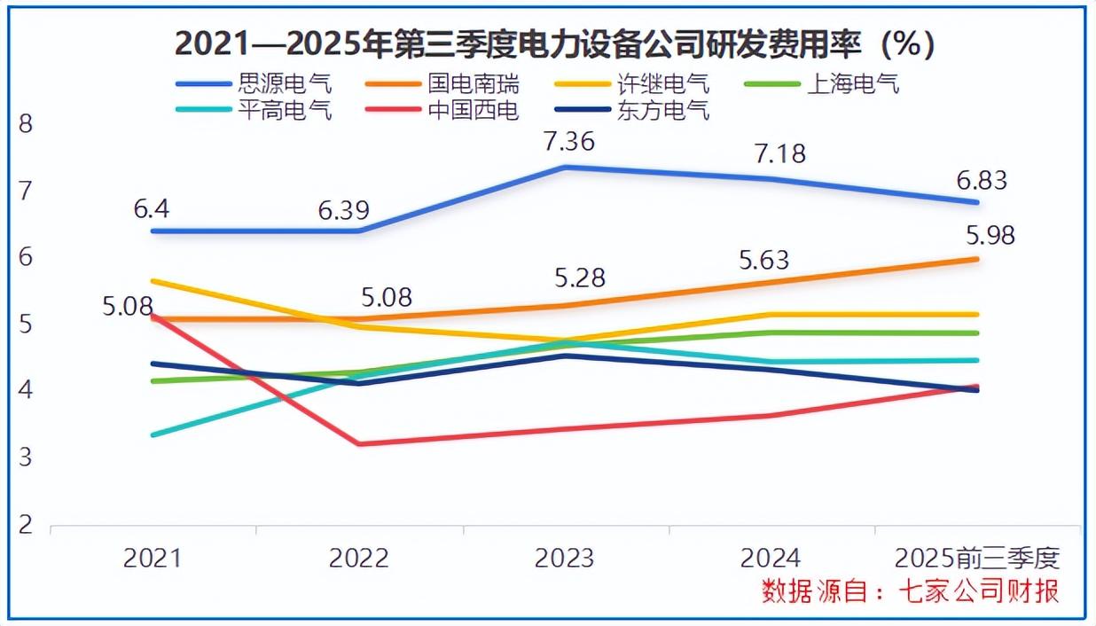 正是看透了这一点,国电南瑞和思源电气在研发上从不吝啬投入,2025年前三季度的研发费用率分别达到5.98%和6.83%,均高于中国西电等一众同行。