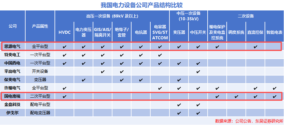 相比国电南瑞,思源电气的产品布局更为齐全,既涵盖二次设备,也布局一次设备,在产品品类和电压等级上,更是能直接对标国际巨头日立能源。