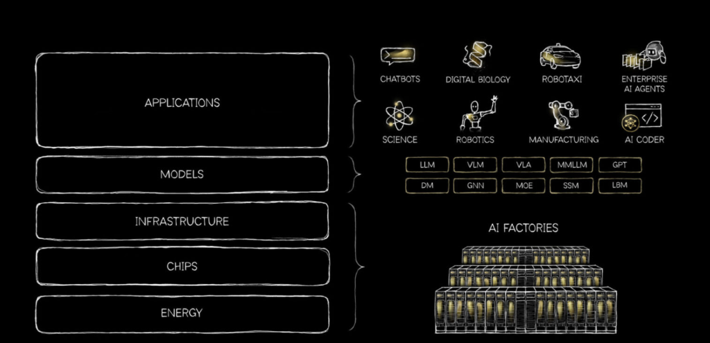 在文章中,黄仁勋提出了一个AI产业的结构框架:五层技术栈——能源、芯片、基础设施、模型、应用。他强调,这五层之间是强耦合关系。