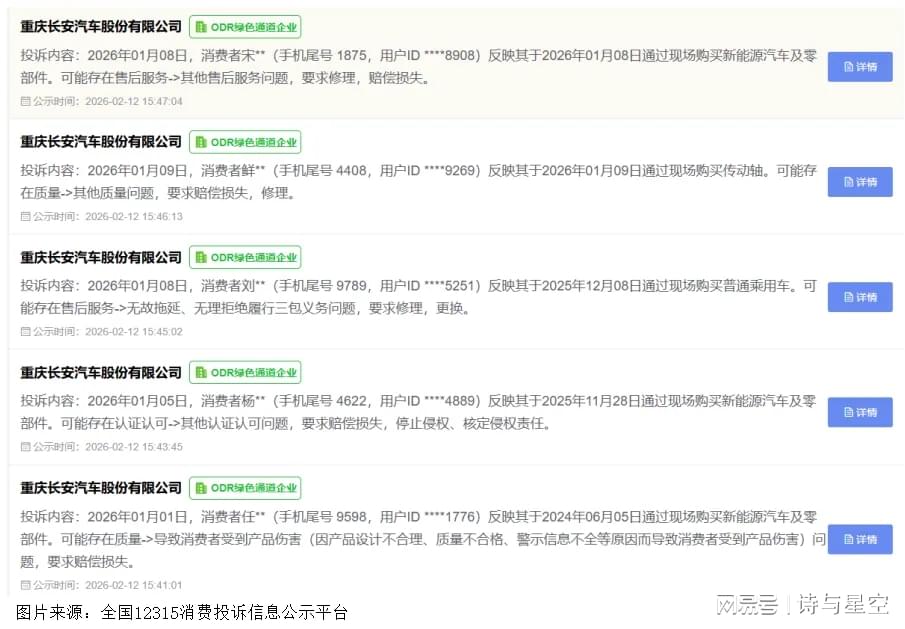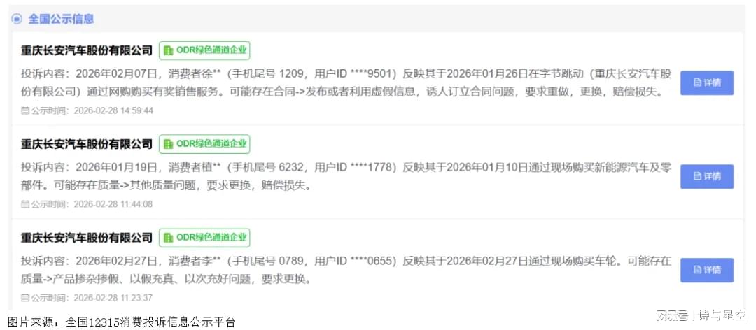 根据12315平台公示信息,2026年1月以来,多名消费者投诉长安汽车存在产品掺杂掺假、以假充真、以次充好的问题,另有投诉涉及无故拖延、无理拒绝履行三包义务及虚假宣传。