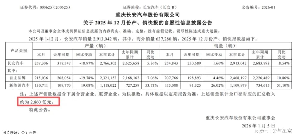 根据公司公布的12月产销快报显示,2025年长安汽车全年营收约为2860亿元,销量更是达到了291.3万辆的惊人数字,同比增长8.54%,创下了近九年来的历史新高。