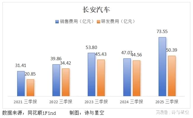 另外,为了实现“香格里拉”计划,长安在研发和营销上进行了巨额投入。2025年前三季度,公司研发投入同比增加13.07%,销售费用更是激增56.25%。