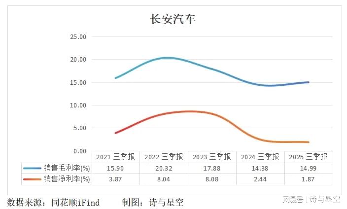 2025年前三季度,长安汽车归母净利润为30.55亿元,同比下滑14.66%;即便扣除非经常性损益后归母净利润为20.18亿元,同比增长20.08%,但整体净利率仍徘徊在1.87%的低位。