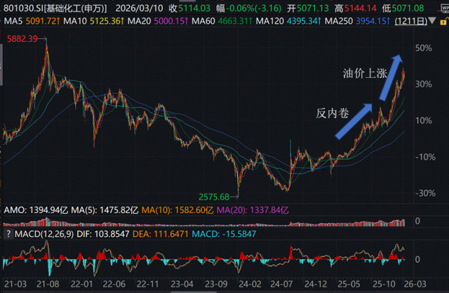 2026年初至今,基础化工指数迎来加速主升浪,核心来自周期板块的高关注度和近期国际油价冲高的共振。