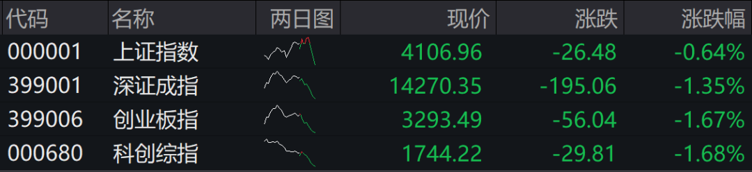 截至午盘,沪指跌0.64%,深成指跌1.35%,创业板指跌1.67%,科创综指跌1.68%。