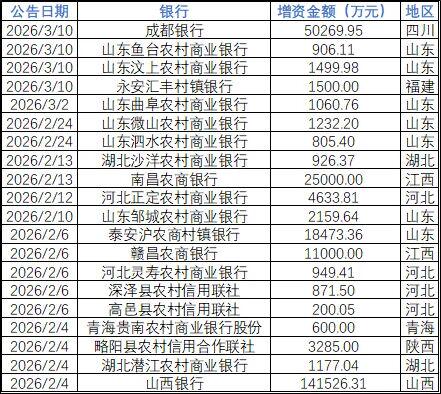 3月10日,四川金融监管局发布的公告显示,已批复通过了成都银行关于变更注册资本的请示,同意成都银行增加注册资本5.03亿元,注册资本增至42.38亿元。同日,山东省济宁金融监管分局连发两则批复公告,通过了鱼台农商行和汶上农商行的增资请示,两家地方银行分别获批增加注册资本约906万元、1499万元。