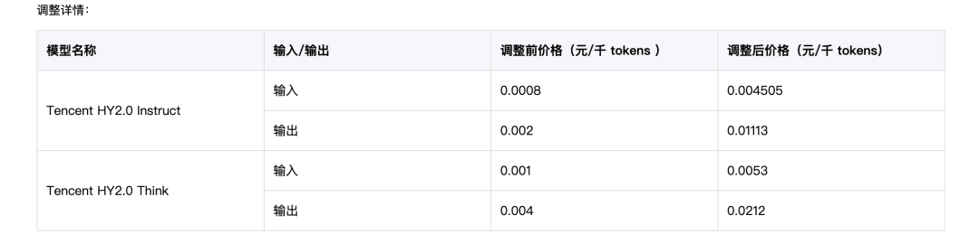 另一变化则是对混元系列模型Tencent HY2.0 Instruct与Tencent HY2.0 Think服务进行涨价。根据腾讯云披露的调整详情:Tencent HY2.0 Instruct输入价格从0.0008元/千tokens调整为0.004505元/千tokens,涨幅超460%;输出价格也从0.002元/千tokens调整至0.01113元/千tokens,涨幅超450%。Tencent HY2.0 Think输入价格从0.001元/千tokens调整为0.0053元/千tokens,输出价格从0.004元/千tokens调整为0.0212元/千tokens。