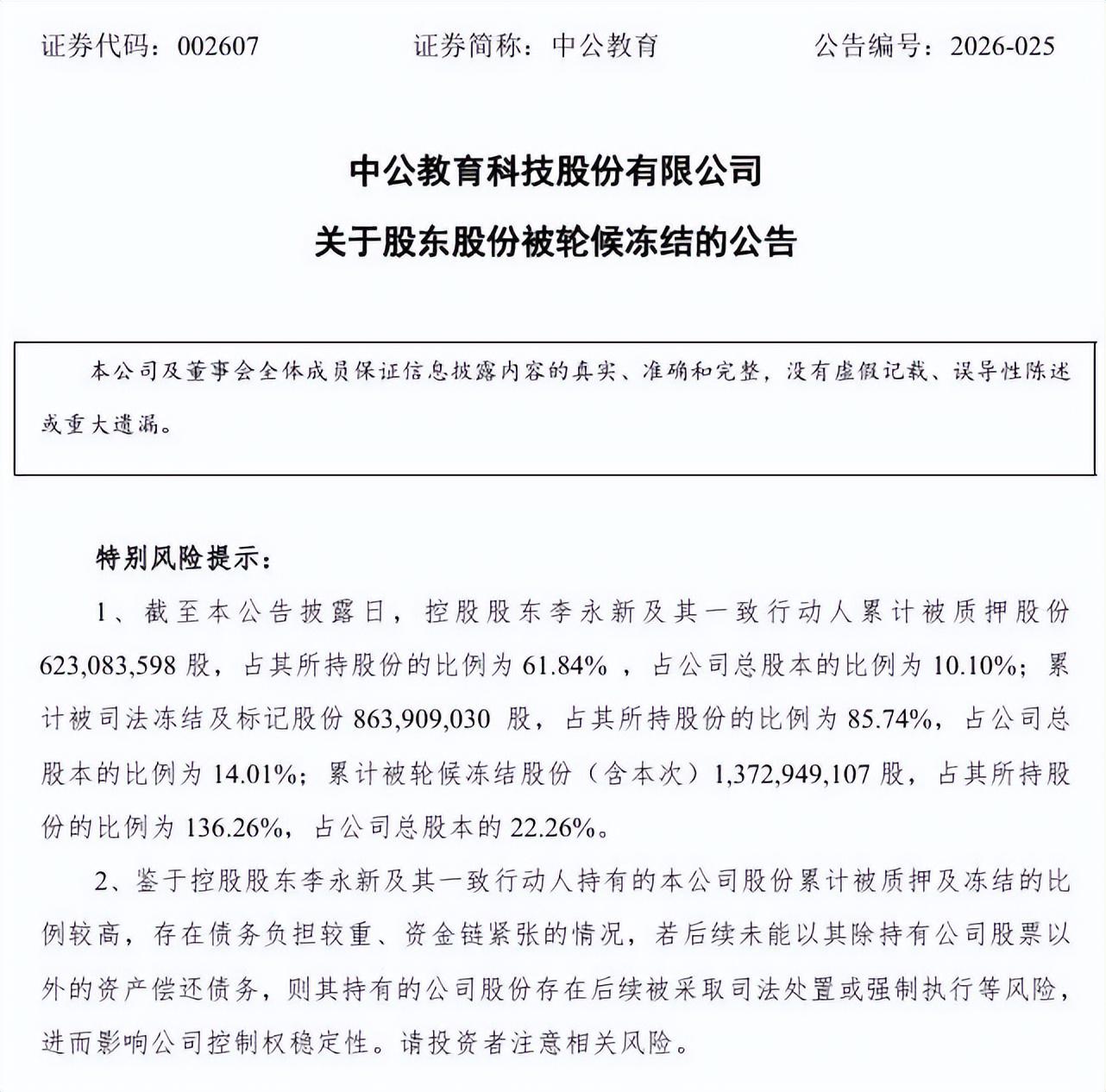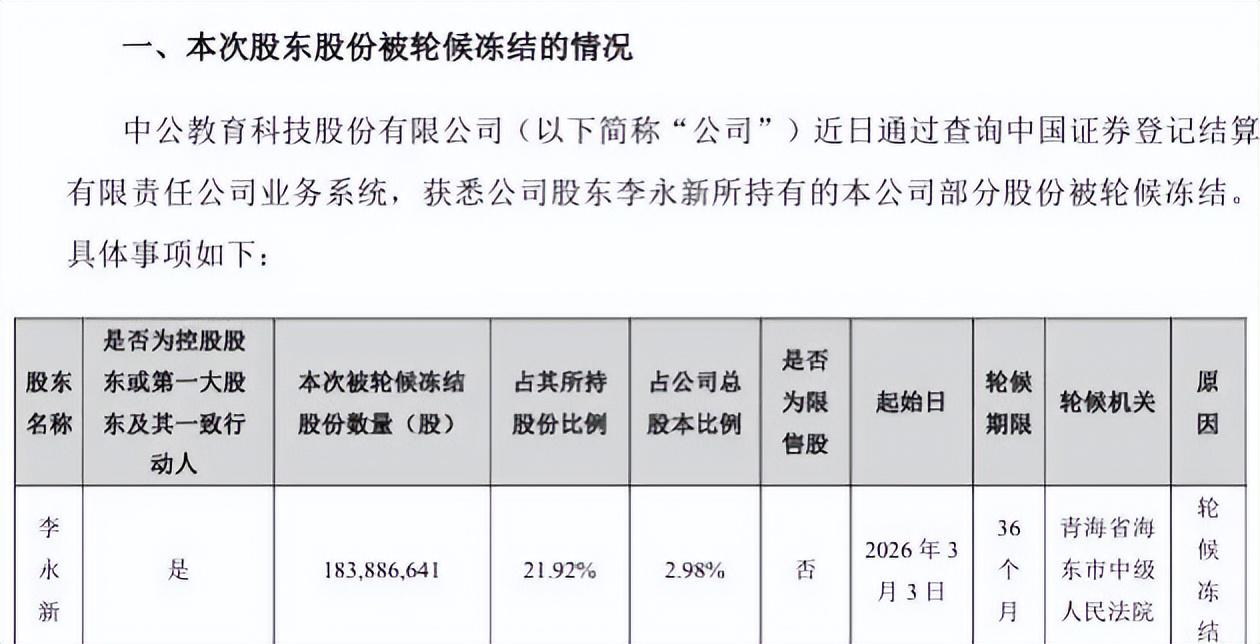 中公教育(002607.SZ)控股股东股份冻结风波持续发酵。3月6日,公司公告披露控股股东李永新所持1.84亿股股份被青海省海东市中级人民法院轮候冻结,涉案金额约1.395亿元。3月10日,公司通过互动平台集中回应市场关切,明确无管理层更换计划,同时提示控股股东高比例质押冻结下的控制权稳定性风险。