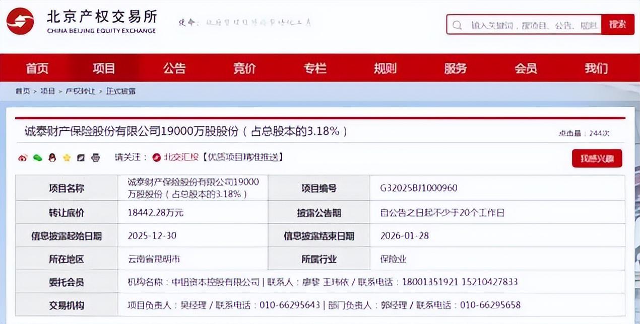 2025年12月,诚泰财险约1.9亿股股份在北京产权交易所挂牌转让,转让方为云南冶金集团股份有限公司(下称“云南冶金”),转让底价为1.84亿元,信息披露结束日期为2026年1月28日。最终,未转让成功。