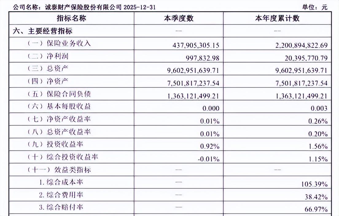 2025年末,公司投资收益率及综合投资收益率分别为1.56%、1.15%,尽管投资收益率不高,但这一年的总资产为96.03亿元,净资产达75.02亿元,投资收益的绝对额仍勉强覆盖承保业务导致的亏损。