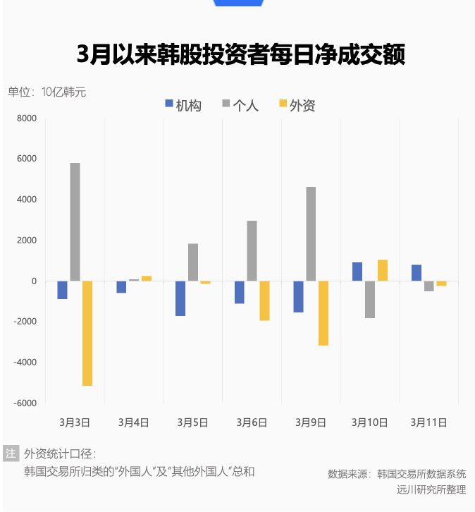 与此同时,韩国交易所的统计还显示了一个有趣的现象。3月以来的行情中,韩国本土散户在净买入,而外资在净卖出,这似乎又在重现2020年疫情风暴时,波动越大,外资越怂,散户越轴的现象。