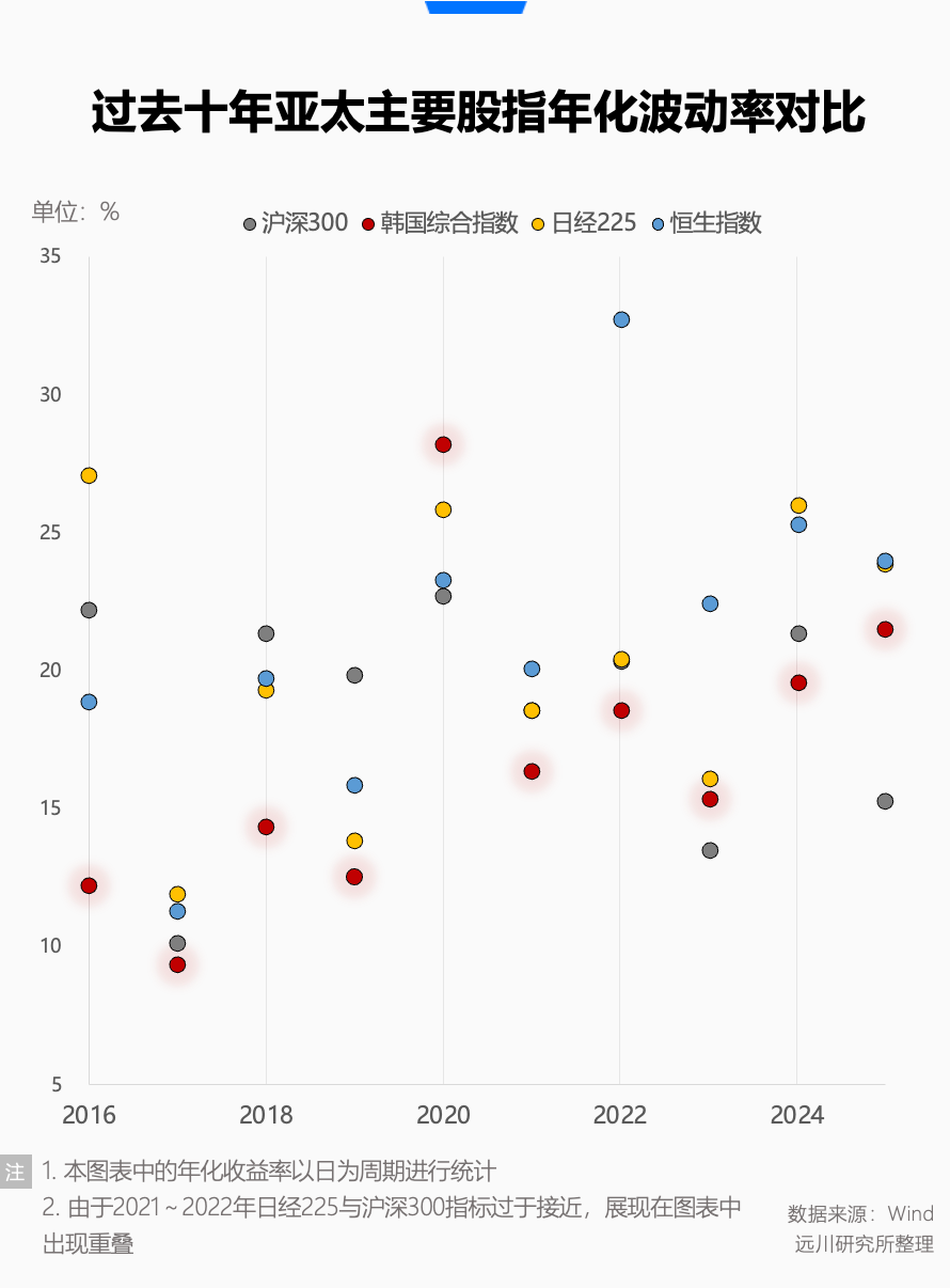实际上,在过去十年亚太四大股指(沪深 300、恒生指数、日经 225 和韩国综合指数)中,沪深 300 的年化波动率为 18.12%, KOSPI 为 18.90%,反而日经 225 以 20.50% 位列第二。恒生指数以 21.79 %的波动率居首,也算是不太出人意料。