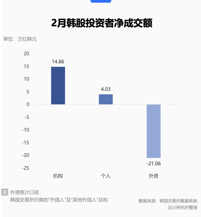 自去年5月以来,外资对韩股市场整体上保持净买入的态势,但在韩股创下 6000 点后开始批量结账。2月的外资净卖出也创下历史新高,达到21.1万亿韩元(约998亿人民币),仅 KOSPI 盘中刷新历史高点的2月27日当天,外资净卖出就有7万亿韩元(约324亿人民币)。