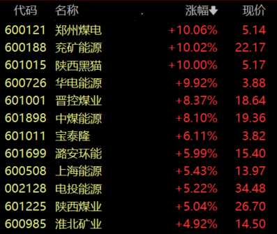 具体来看,煤炭板块走高,郑州煤电、兖矿能源、陕西黑猫、华电能源涨停。