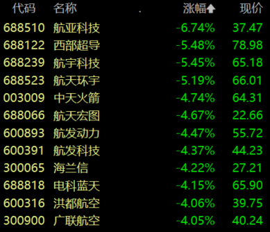 军工装备板块调整,航亚科技跌超6%,西部超导、航宇科技、航天环宇跌超5%。