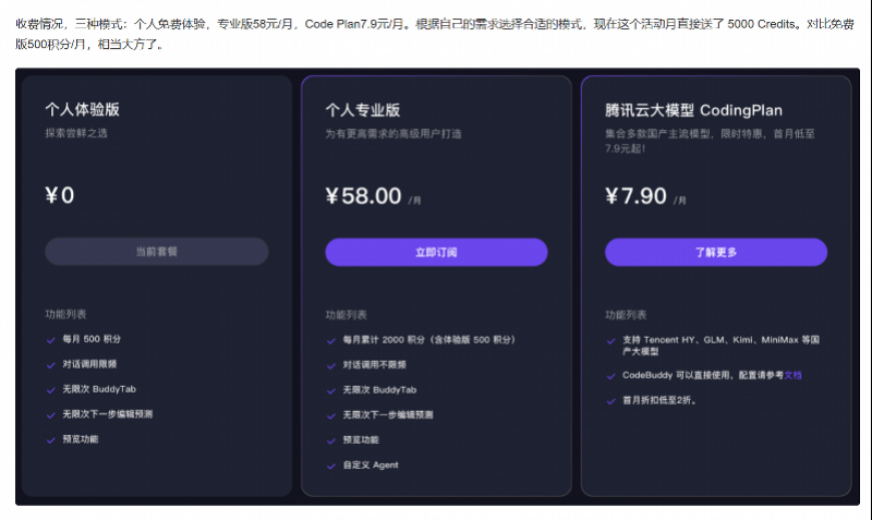 记者实测发现,腾讯小龙虾目前注册即可免费使用,涵盖办公、编程、数据分析等场景,目前无任何部署成本和额外费用。同时,腾讯也推出了收费方案:个人免费体验(目前直接向所有用户送了5000Credits),专业版58元/月,Code Plan7.9元/月。