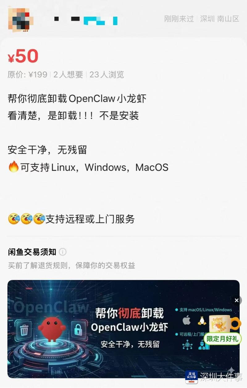 与此同时,在二手交易平台,也出现了“收费上门卸载”的服务,记者联系其中几家咨询,其中在线远程协助卸载的价格为50-100元不等,而上门服务则根据距离远近等有不同收费。