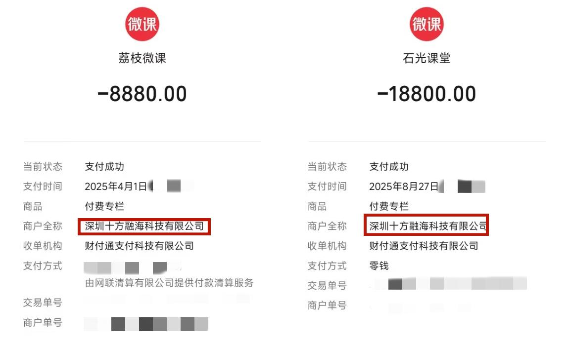 李女士告诉红星资本局,2025年5月左右,她的婆婆第一次接触梨花声音研修院,并购买了相关配音课程,而后多次付费(收款方多为十方融海)购买课程及相关设备。