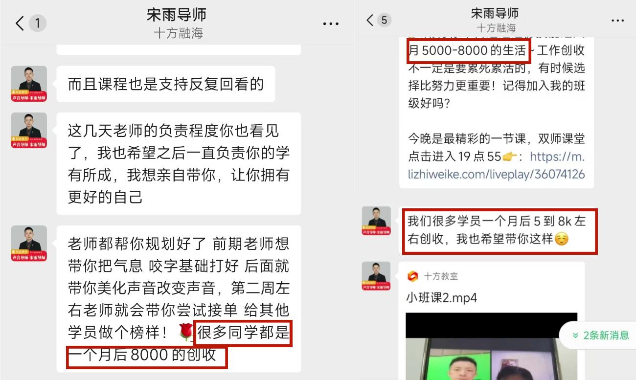 范女士提供的截图显示,在学习过程中,课程导师(即十方融海工作人员)一直使用企业微信与她沟通,多次强调大部分学员通过学习配音赚到了钱,每月接单收入在5000元到8000元不等。