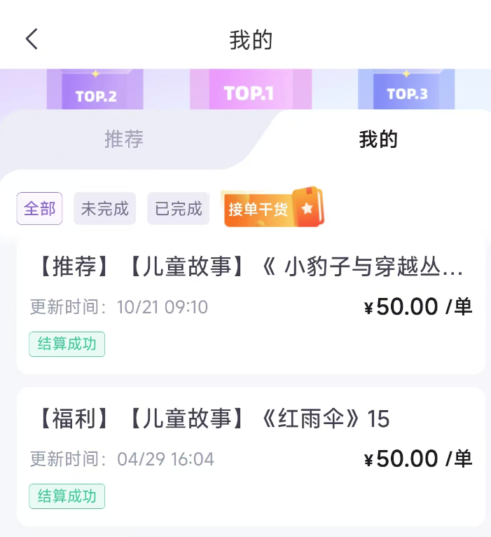 与此同时,范女士在梨花声音研修院APP的试音仅有两次成功,均为儿童故事类音频,一单50元,共获得报酬100元。
