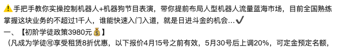 上述宣传提到,该租赁商招收的学徒分为初中高三个等级,对应的学费分别为3980元、6980元、9980元,学习时长为3-7天。学习内容包括:实操机器人和机器狗、掌握活动商单的表演操控指令、抖音视频拍摄指导等。