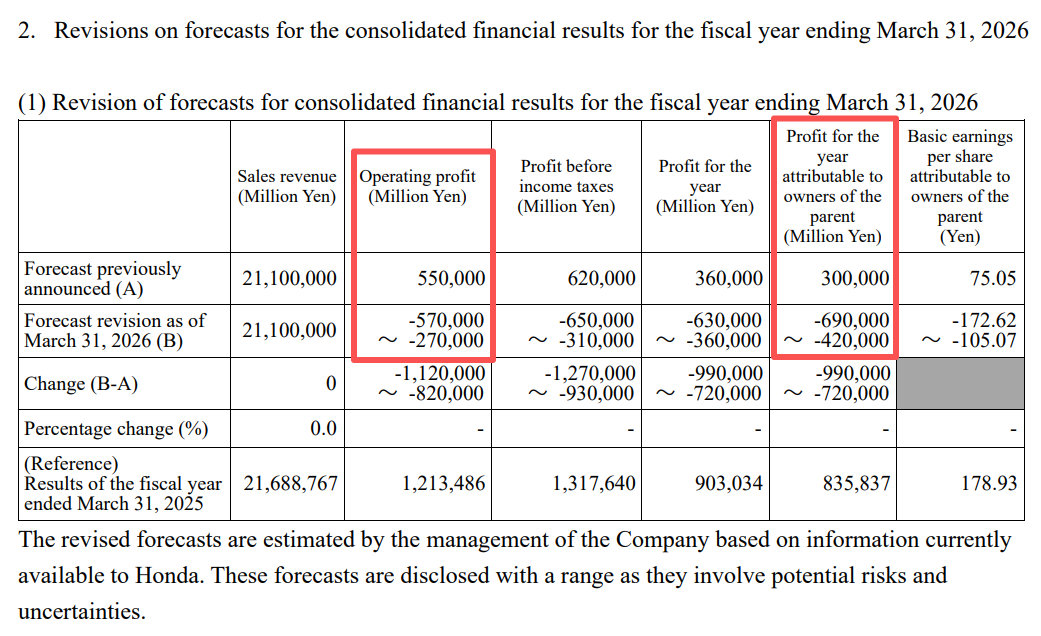刚刚,本田汽车承认,其2025财年(2025.4–2026.3),预计将出现巨额亏损。