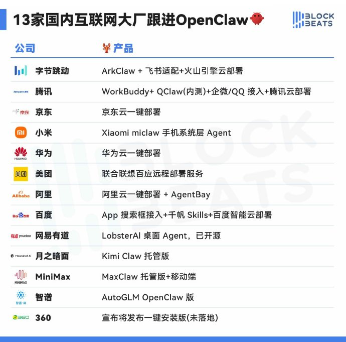 据统计,现在已有字节、腾讯等13家互联网大厂跟进OpenClaw,纷纷推出一键部署服务或相关应用,谁都不想在这波AI风口下掉队。