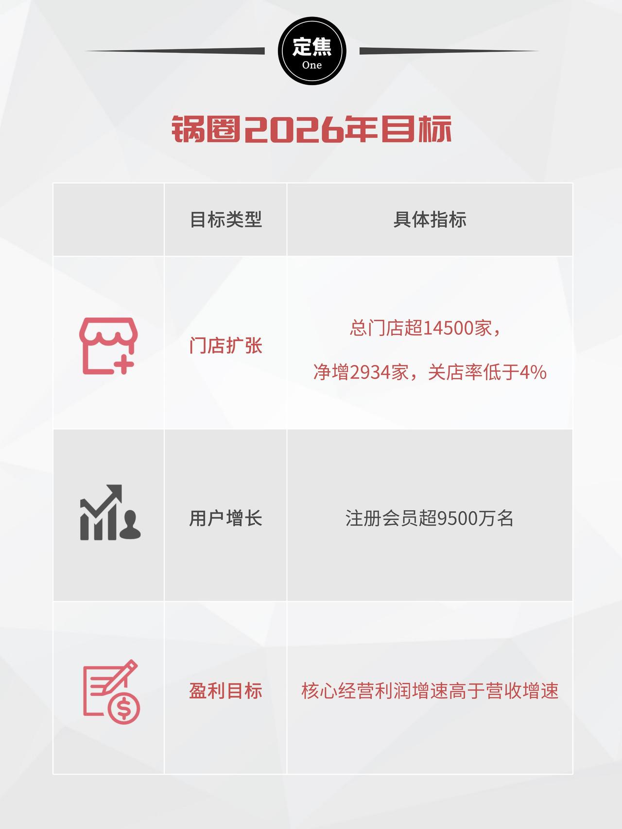 2026年,锅圈计划净增门店2934家,总门店数超14500家,关店率控制在4%以内;注册会员数目标突破9500万名;核心经营利润增速将高于营收增速。