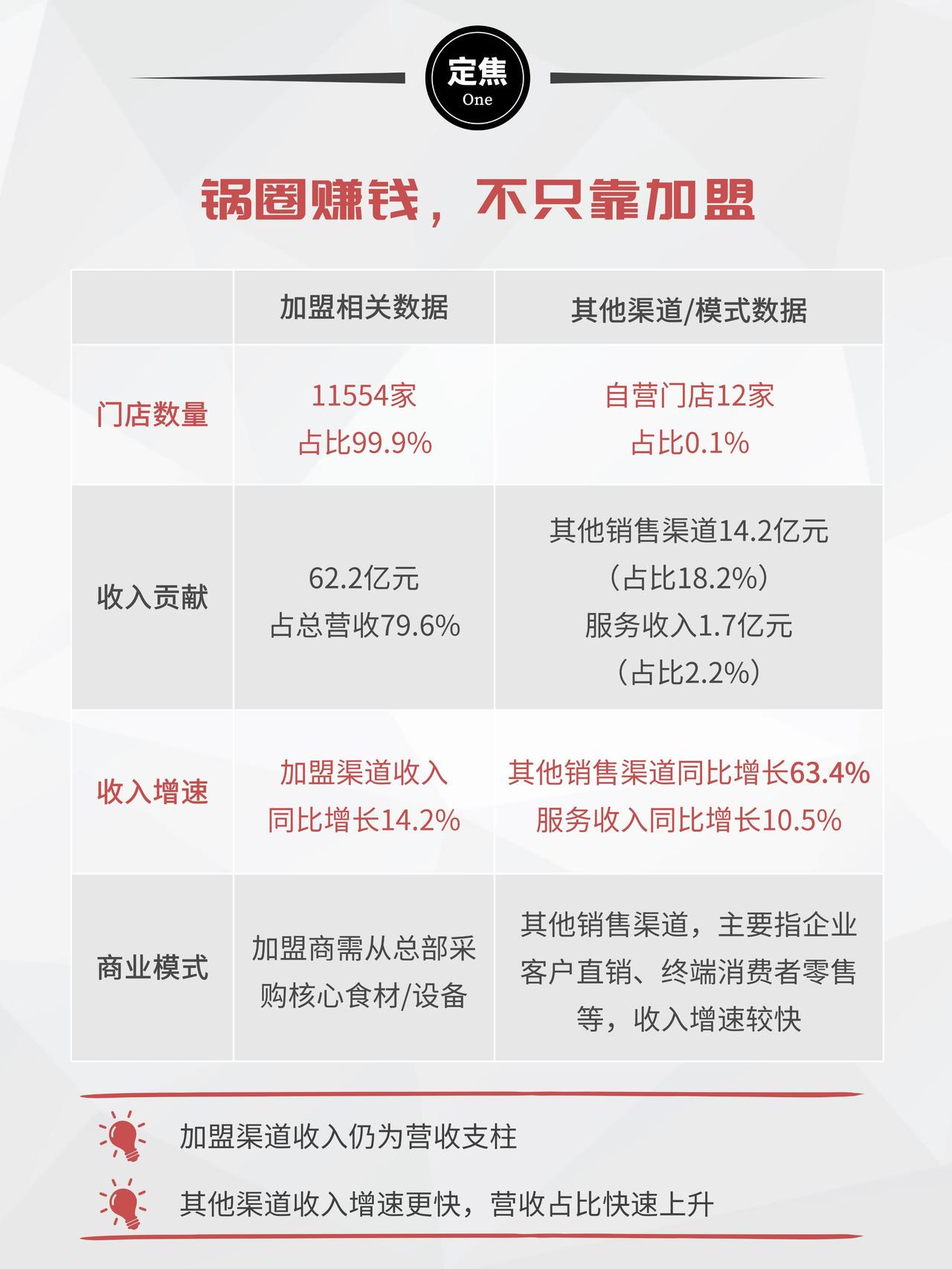 这也注定,锅圈几乎完全依赖加盟模式,在11566家门店中,加盟门店达11554家,占比高达99.9%,自营门店仅12家,占比0.1%;加盟渠道贡献收入62.2亿元,占总营收的79.6%。