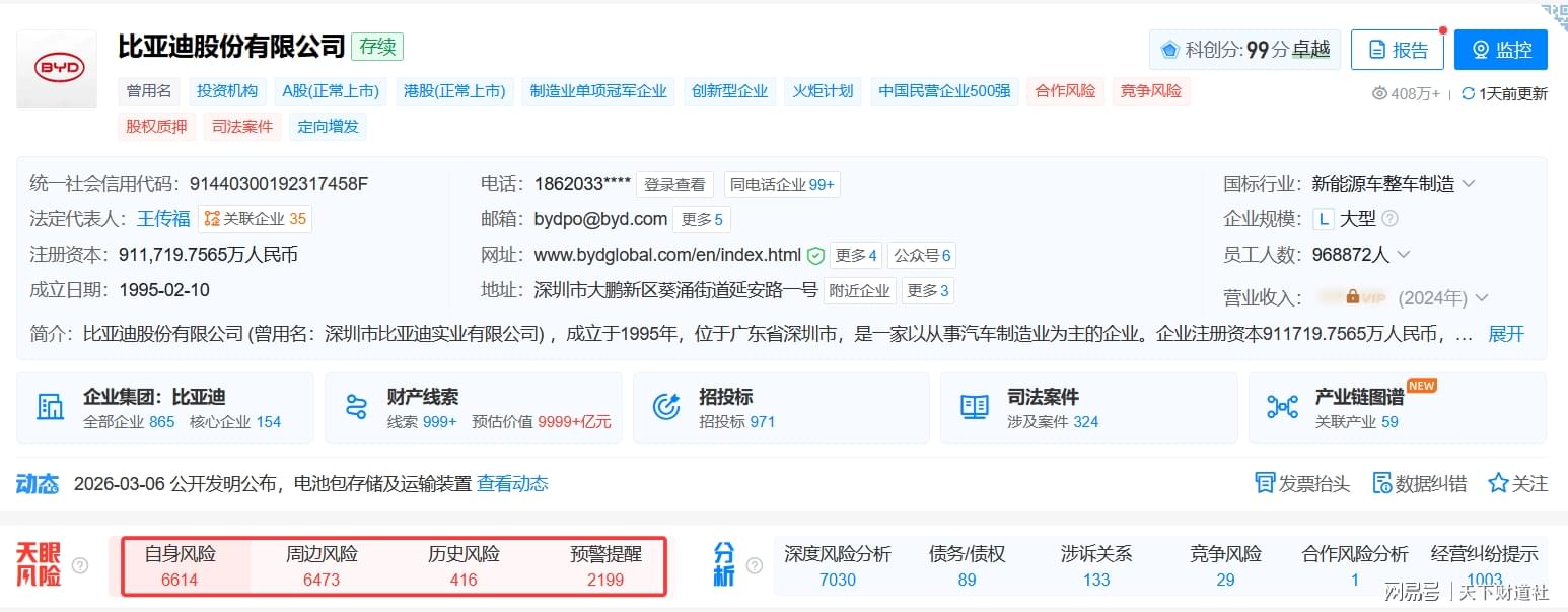 此外,比亚迪整体风控能力亦亟待补强。天眼查显示,其自身风险6614条,周边风险6473条,预警提醒2199条,风险管控体系仍有较大完善空间。