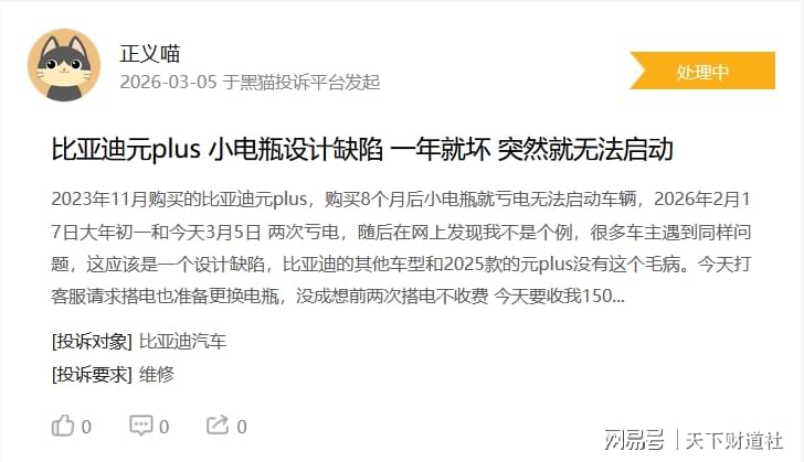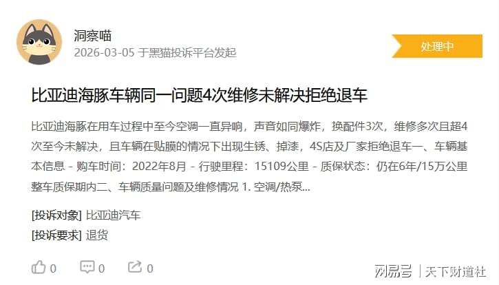 需要注意的是,技术领先不等于商业成功,参数极致不等于用户满意。在黑猫投诉平台上,截至3月6日,比亚迪相关投诉累计超过18000条,涉及车辆质量、售后响应、宣传与实际不符等问题。