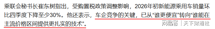 乘联会秘书长崔东树指出,车企竞争关键已从“谁更便宜”转向“谁能在主流价格区间提供更扎实的技术”。