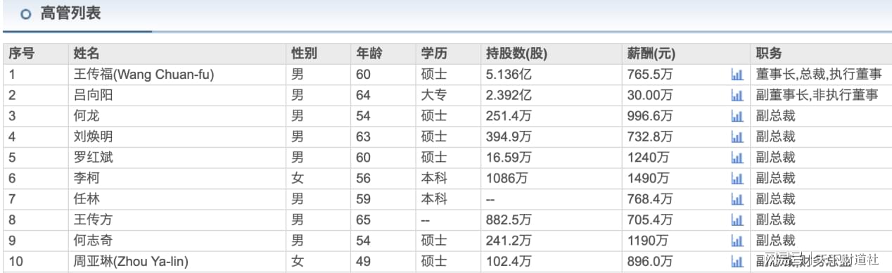 不过,比亚迪公司高管仍持有大量比亚迪股票,其中董事长兼总裁王传福持有5.13亿股,副董事长吕向阳持有2.39亿股,其他高管大部分持股一千万至几百万不等。比亚迪股票的大跌,对他们的持仓市值也有不小的影响。