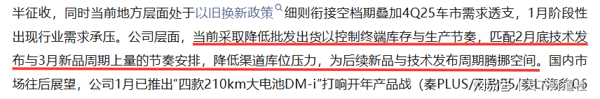 中泰证券则认为,比亚迪采取降低批发出货,是为控制终端库存与生产节奏,匹配2月底技术发布与3月新品周期上量,降低渠道库位压力,为后续新品与技术发布腾挪空间。