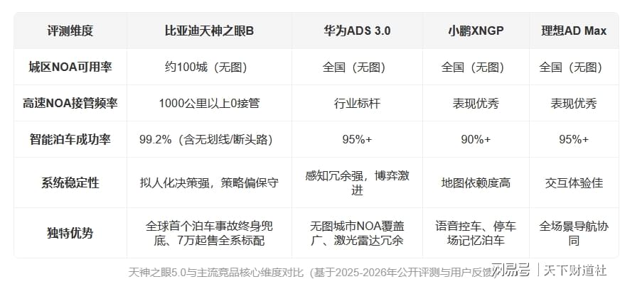 智驾领域,天神之眼5.0虽搭载新模型,但算法软实力仍是短板,对比华为ADS 3.0、小鹏XNGP等头部智驾方案,只能说各有千秋。