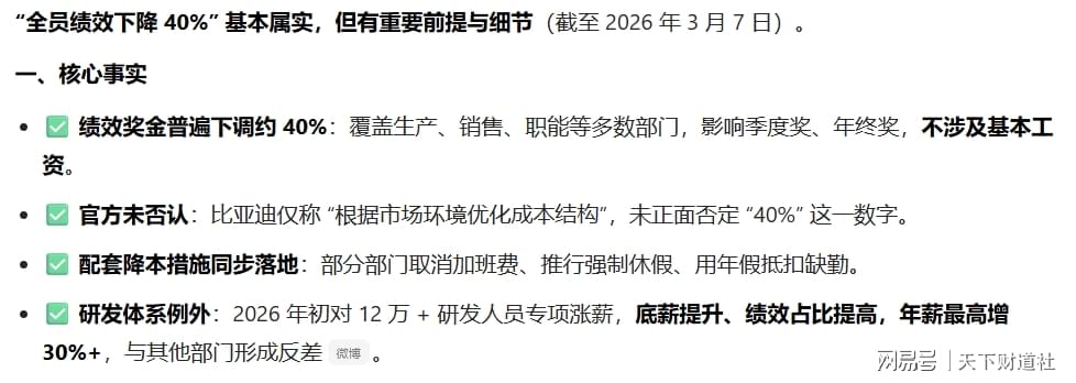 这一消息并非空穴来风,但也不够准确。根据权威检索结果,绩效下降40%不涉及比亚迪研发体系,比亚迪有关方面称“根据市场环境优化成本结构”。