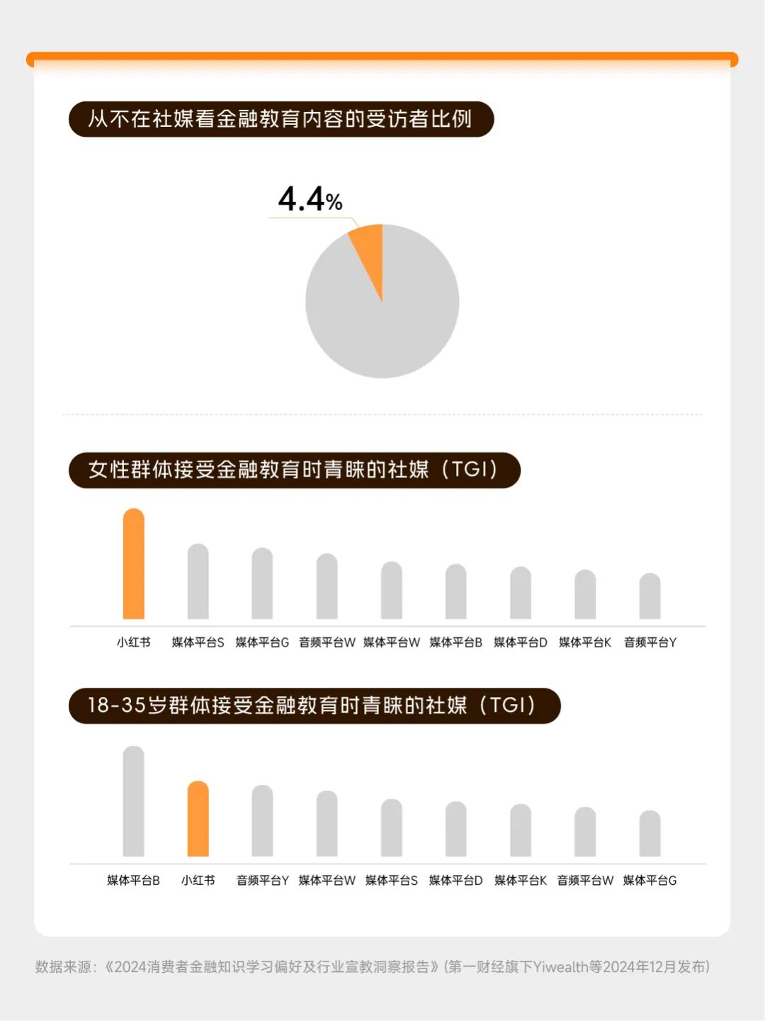 值得关注的是,以小红书为代表的线上内容和社交媒体平台,正在成为投资者获取金融信息不可或缺的渠道。第一财经旗下Yiwealth2024年12月发布的一份调研显示,仅有不到5%的金融消费者从未在社媒平台上获取过金融知识,且小红书在女性群体和18-35岁的年轻群体中均有着更高的渗透率。