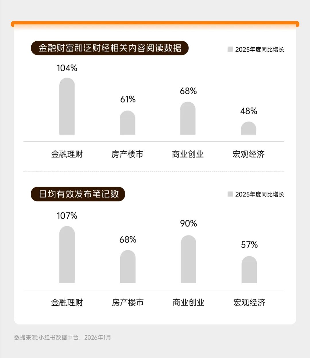 首先,金融内容呈现爆发式增长。《小红书金融行业白皮书》(后文简称《白皮书》)显示,2025年,小红书金融财富和泛财经相关内容类目快速增长,其中,“金融理财”相关笔记阅读数同比增长104%,日均有效发布数同比增长107%。(小红书数据中台2026年1月数据)