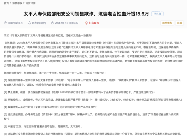 与此同时,而太平人寿早期推出的分红险产品,还在遭到投诉,投诉原因均为“销售误导”。如2025年8月14日,一位消费者在红网“百姓呼声”页面称,2015年太平人寿保险公司业务员屡次上门推销主险为“太平福禄满堂终身寿险(分红险)”,过程中存在销售误导;另一名消费者2025年8月在黑猫投诉平台上称太平保险在销售保险产品过程中存在严重的误导行为,涉及产品为“太平金无忧终身寿险(分红型)”。