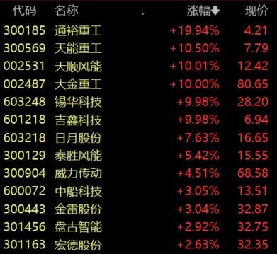 具体来看,风电设备板块走高,通裕重工、天顺风能、大金重工、锡华科技、吉鑫科技涨停。