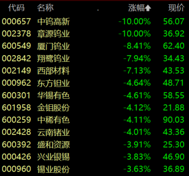 小金属板块调整,中钨高新、章源钨业跌停,厦门钨业跌超8%,西部材料跌超7%。
