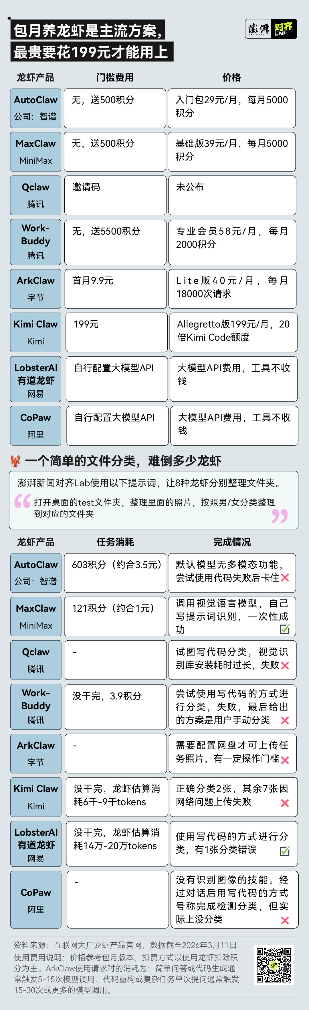 用户越多,Token消耗越多,坐收渔利,旱涝保收。根据澎湃对齐Lab统计,如今,国产龙虾按月包养是主流方案,最贵要花199元才能用上,但一个简单的文件分类,就难倒了许多龙虾。