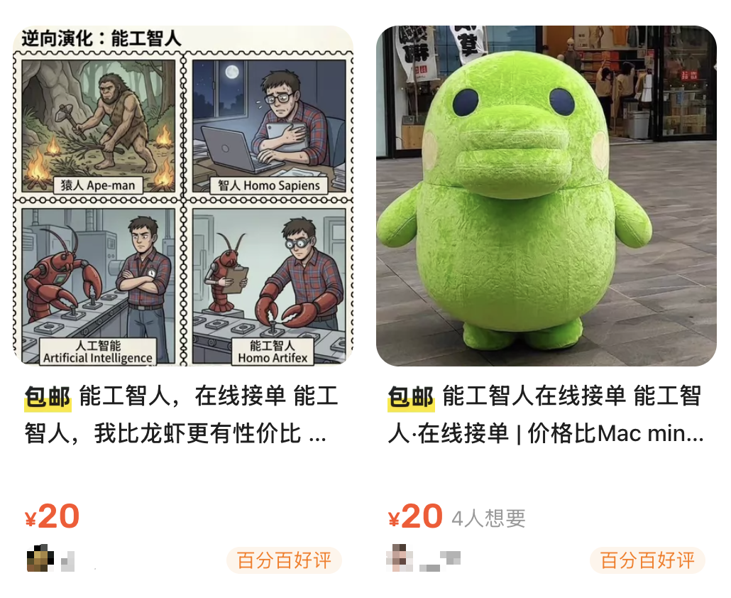 甚至,连「能工智人」也悄悄上线。有人在平台上挂出广告:养龙虾500元起,租赁机器人5000元一天,本人提供人工服务,20元起,什么都能干,只有想不到没有做不到。