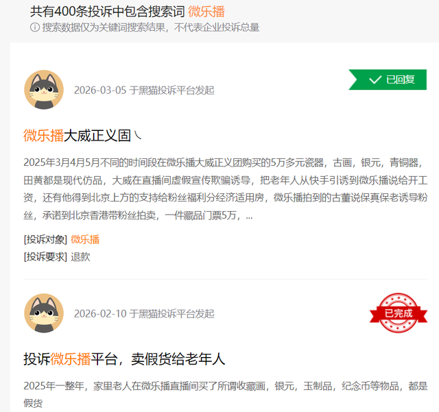 深圳就有老人花2988元购买所谓“钞王”、山东老人拿出11万养老钱购买“扶贫藏品”的案例,而这类直播多通过“微乐播”等平台传播,该平台仅在黑猫投诉上的累计投诉就达400条。